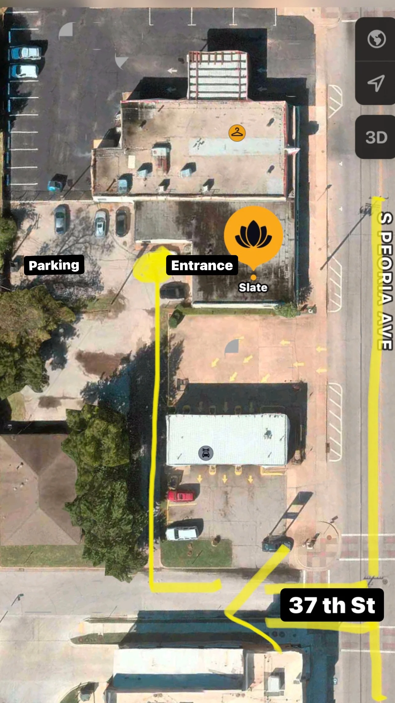 You will see a hidden driveway on the RIGHT hand side immediately after the construction area and in front of a brick building. Turn into that hidden driveway and drive all the way to the end. You will see a door labeled “SLATE ENTRANCE”. Park and come on in! 🎉
